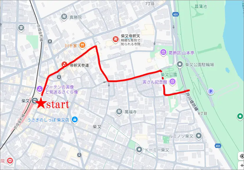 約2時間の葛飾柴又フォトウォークに行ってきた。今回のルートはこんな感じ
