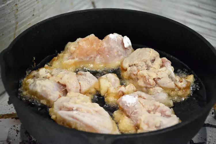 ①鶏肉に片栗粉を混ぜて、スキレットに投入